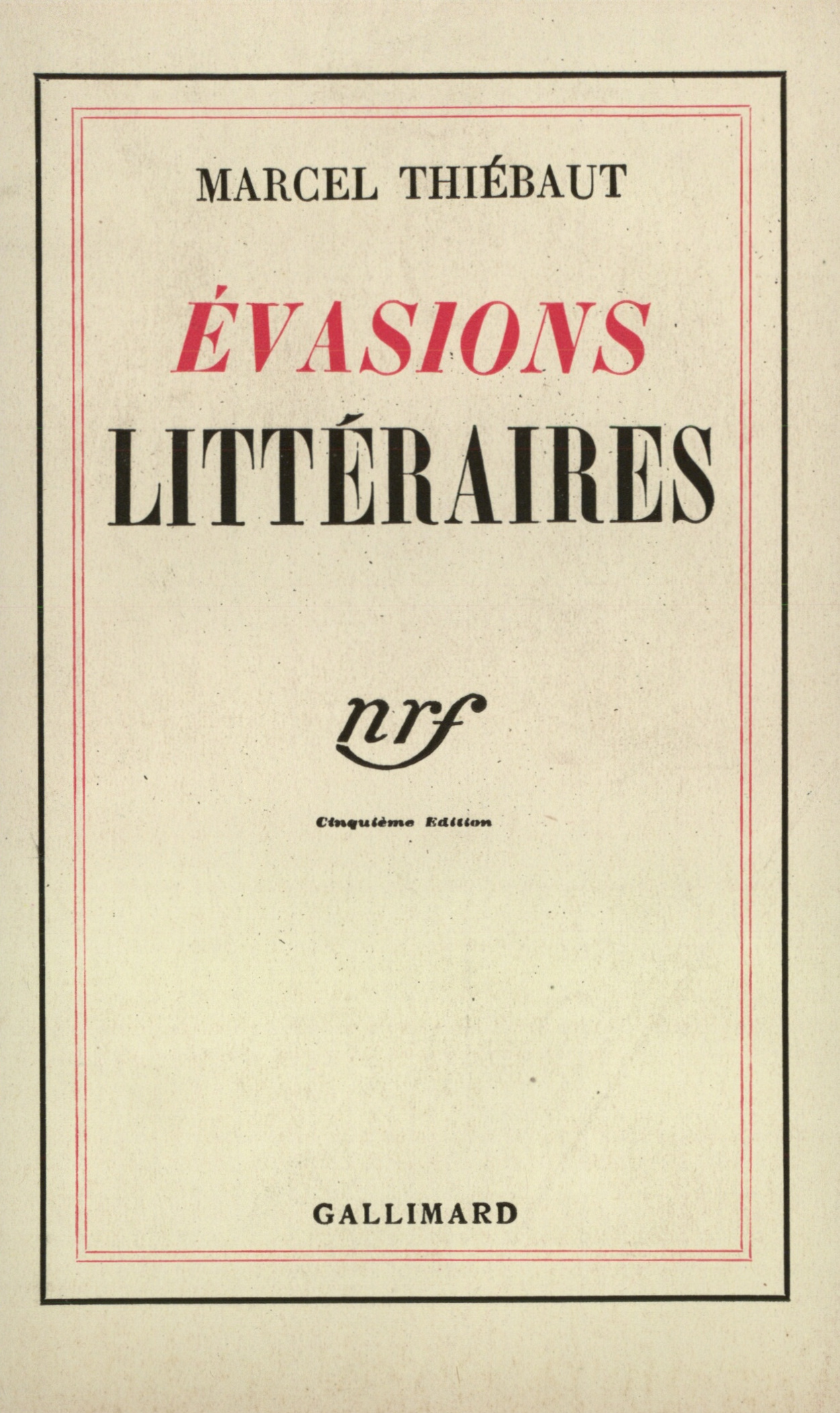 Lire un extraitLire un extrait Télécharger la couverture Partager Partager sur Facebook WhatsApp E-mail Marcel ThiébautÉvasions littéraires Collection Blanche Gallimard Parution09-03-1935 Présentation Détails GenresEssais Thèmes littérature CatégoriesConnaissance > Essais littéraires 258 pages, 118 x 185 mm ISBN2070262472 Gencode9782070262472 Code distributeurA26247