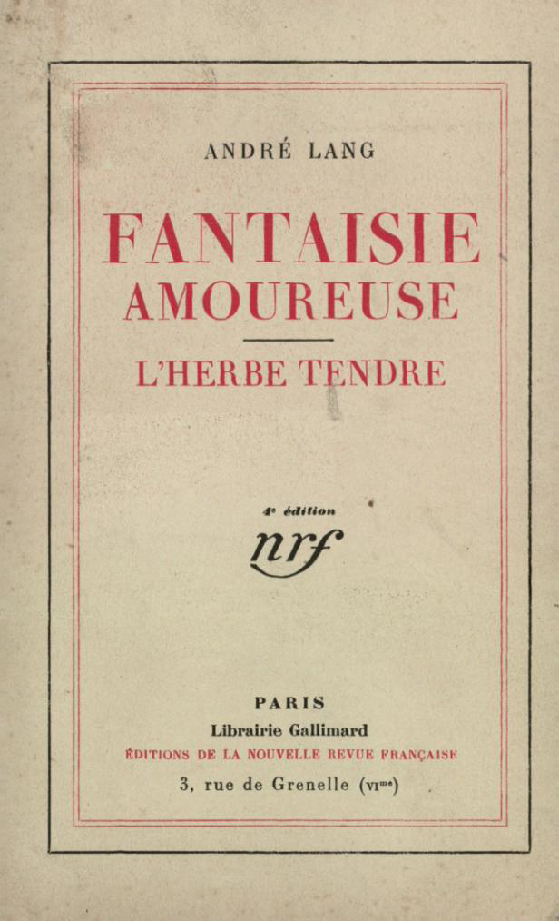 Lire un extraitLire un extrait Télécharger la couverture Partager Partager sur Facebook WhatsApp E-mail André LangFantaisie amoureuse suivi de L'Herbe tendre Collection Blanche Gallimard Parution06-03-1929 Présentation Détails GenresThéâtre CatégoriesLittérature française > ThéâtrePoésie et théâtre > Théâtre 240 pages, 118 x 185 mm ISBN2070237133 Gencode9782070237135 Code distributeurA23713