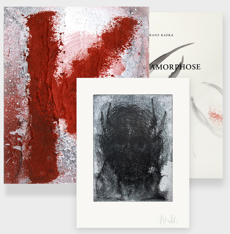 Ce coffret créé tout spécialement par l’artiste comprend l’ouvrage La Métamorphose de Franz Kafka avec les œuvres originales de Miquel Barceló dans la collection grande blanche avec une couverture dessinée spécialement pour cette édition et imprimée sur papier BFK Rives, ainsi qu’une gravure originale réalisée en bitume de Judée et aquatinte, eau-forte et brunissoir sur papier BFK Rives, numérotée et signée par l’artiste.