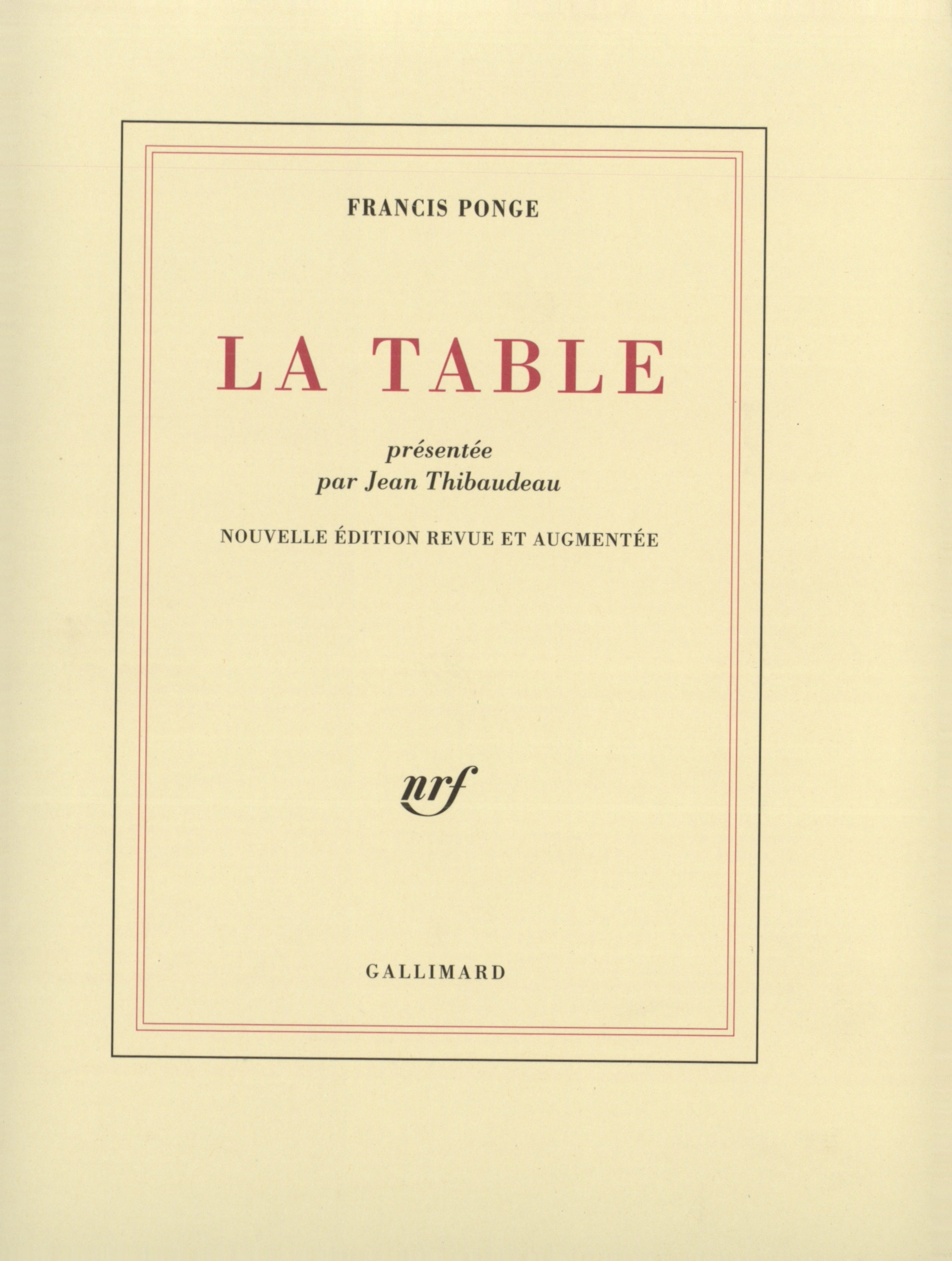 Ayant écrit (publié en 1964) Le Pré, Francis Ponge à ses yeux a achevé sa tâche. Il n'a plus qu'à répondre aux commandes, et continuer de révéler son œuvre, - et noter d'autre part la partition de son chef-d'œuvre ultime, La Table, ni «dossier», ni «fabrique», mais autre chose.