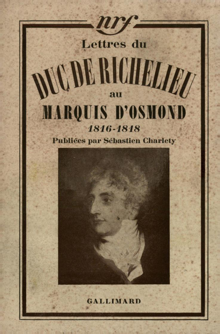 Lire un extraitLire un extrait Télécharger la couverture Partager Partager sur Facebook WhatsApp E-mail Duc de RichelieuLettres au marquis d'Osmond(1815-1818)Présenté par Sébastien Charléty Collection Hors série Littérature Gallimard Parution30-03-1939 Présentation Détails GenresCorrespondances Thèmes histoire > Époque contemporaine (1789 – av. 1914) CatégoriesLittérature française > Correspondances 256 pages, sous couverture illustrée, 140 x 205 mm ISBN2070254259 Gencode9782070254255 Code distributeurA25425