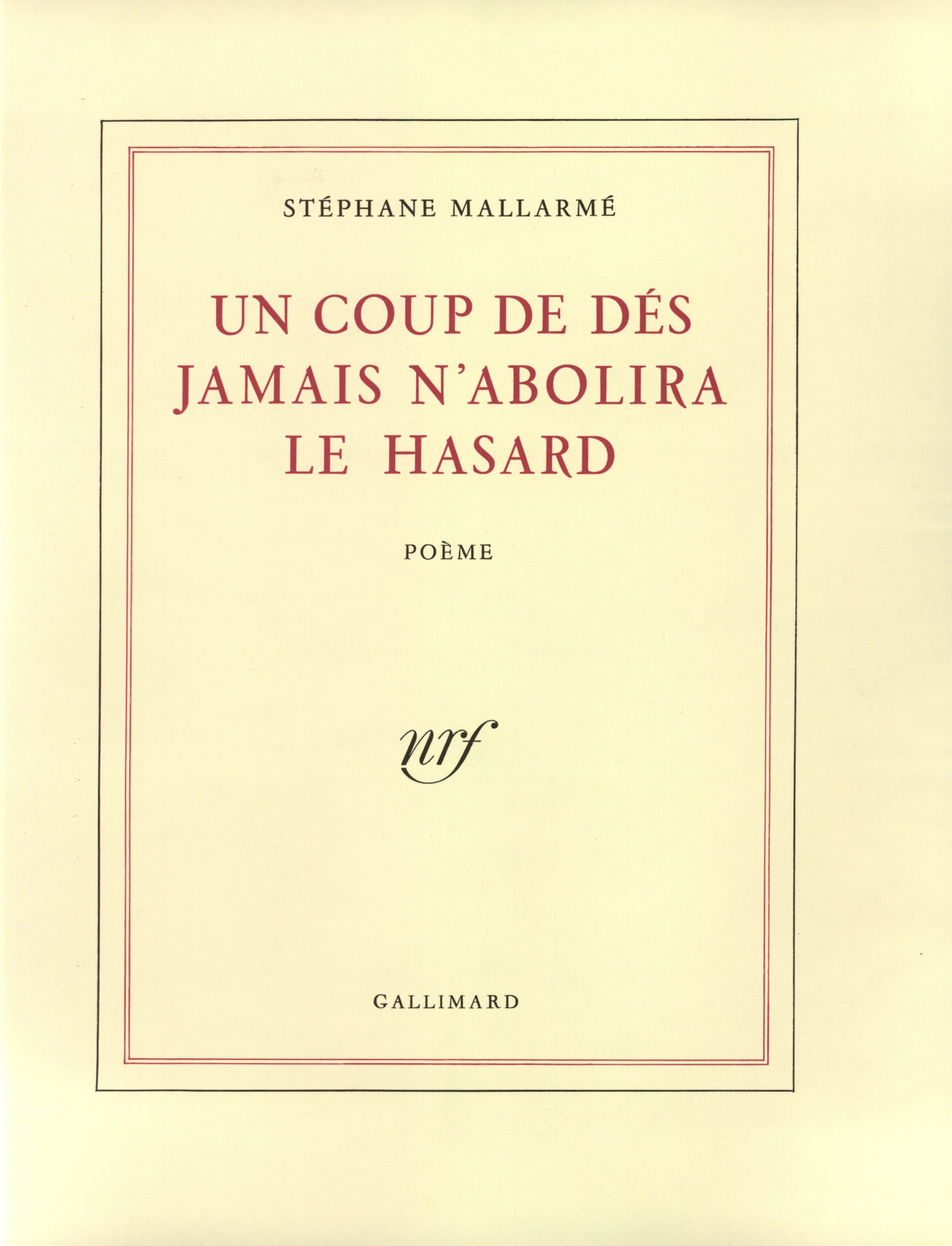 Télécharger la couverture Partager Partager sur Facebook WhatsApp E-mail Stéphane MallarméUn Coup de dés jamais n'abolira le hasardPremière parution en 1914 Collection Blanche Gallimard Parution28-07-1993 Présentation Détails GenresPoésie CatégoriesLittérature française > PoésiePoésie et théâtre > Poésie 32 pages, 250 x 325 mmAchevé d'imprimer : 16-7-1993 ISBN9782070736492 Gencode9782070736492 Code distributeurA73649 Voir plus Voir moins Livre imprimé 24.00 €